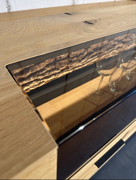 Kerneiche natur massiv, gebürstet Aplikation Rinde, incl. Beleuchtung2 Türen, 1 Klappe, 2 SchubkästenBreite 173 cmHöhe 116 cmTiefe 44 cm