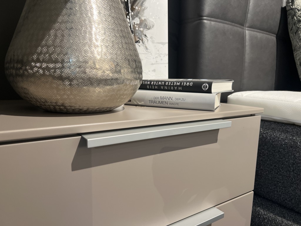 Nachttisch mit 3 Schub Modell LINEA CONCEPT Ausf Front/Korpus Fango matt Grifffarbe Aluminiumfarben A Breite: 61 cm H: 64 cm T: 41 cmzum Abholpreis2 mal verfügbar